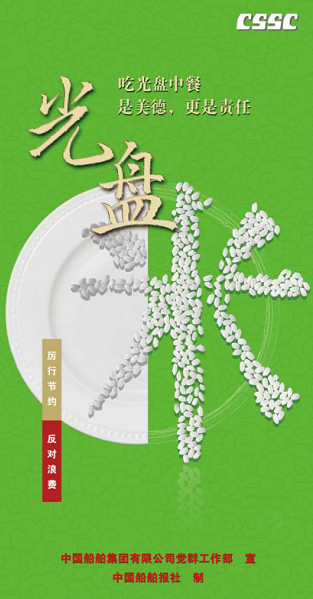 為大力弘揚勤儉節約、珍惜糧食的文明用餐習慣,中國船舶集團近日印發了《組織開展“制止餐飲浪費 踐行光盤行動”專項宣傳引導活動方案》。《方案》提出,要以引導廣大職工養成勤儉節約習慣為目標,以單位食堂、家庭為重點,通過在集團公司持續開展專項宣傳引導活動,全面倡導勤儉節約、反對浪費的文明理念,著力在集團公司推動形成簡約適度、綠色環保、健康文明的飲食方式,讓“文明餐桌”成為廣大職工的一種思想共識和自覺行動。《方案》確定了“廣泛深入動員,凝聚全員共識”“緊盯重點部位,注重示范引領”“堅持依法依規,強化監管督導”“加強輿論宣傳,營造濃厚氛圍”等活動內容,提出了“高度重視,形成專項”“迅速行動,有序推進”“形成常態,貴在堅持”等活動要求。
