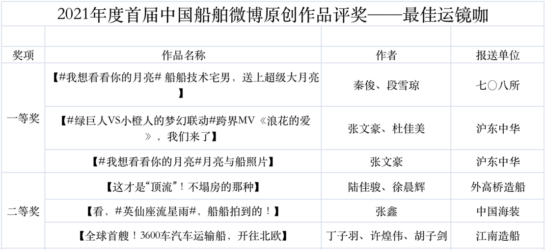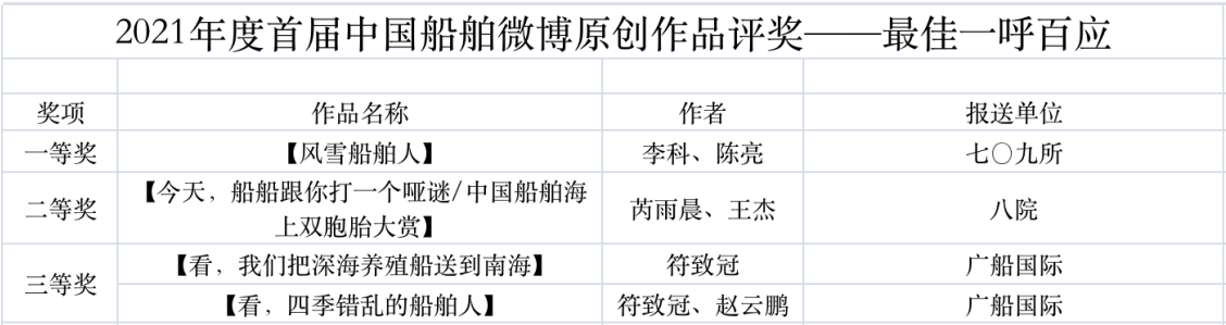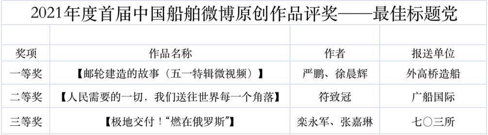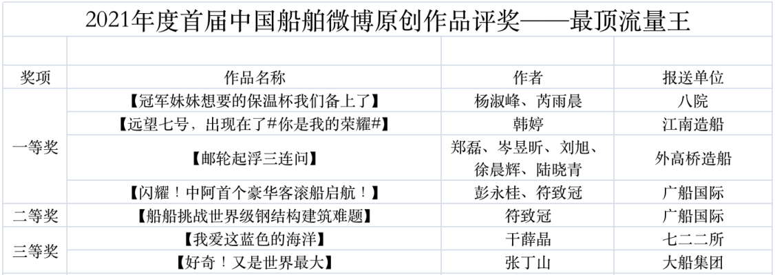為鼓勵(lì)更多成員單位積極加入到中國船舶集團(tuán)新媒體平臺的宣傳中來,在集團(tuán)公司黨群工作部的指導(dǎo)下,中國船舶報(bào)社從不同維度,對2021年度各單位支持“中國船舶”微信的力度進(jìn)行了梳理統(tǒng)計(jì),并利用微博政務(wù)的全國專家?guī)煸u審資源,對2021年度“中國船舶”微博原創(chuàng)作品進(jìn)行了專業(yè)評審,評選結(jié)果公布如下: