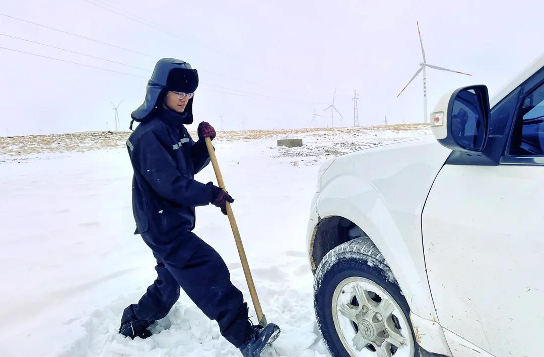 進入11月,內蒙古自治區錫林郭勒盟地區迎來大面積的暴風雪,烏達萊項目人員在趕往風場的路上遭遇積雪路段,雖然氣候嚴寒,但為了及時消除機組故障,大家在積雪路段采取挖雪推車的方式齊心協力,一同開展清理路面積雪的行動。這個冬日,冰雪阻擋不住海裝追風者們勇往直前的步伐,他們只為恪盡職守完成一個承諾——風機旋轉、帶來光熱。
