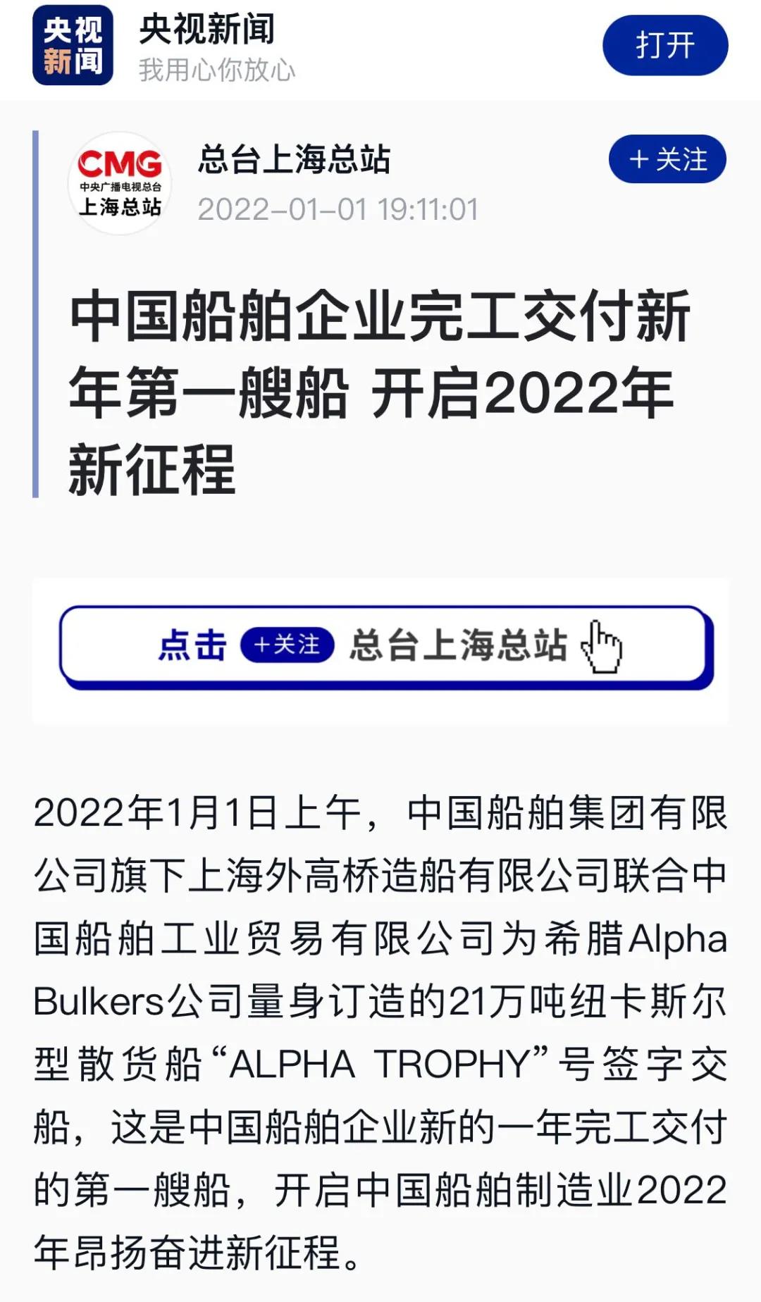 1月1日上午,中國船舶集團旗下外高橋造船聯(lián)合中船貿(mào)易建造的21萬噸紐卡斯爾型散貨船“ALPHA TROPHY”號簽字交船,這是中國船舶企業(yè)新的一年完工交付的第一艘船,開啟中國船舶制造業(yè)2022年昂揚奮進新征程。
