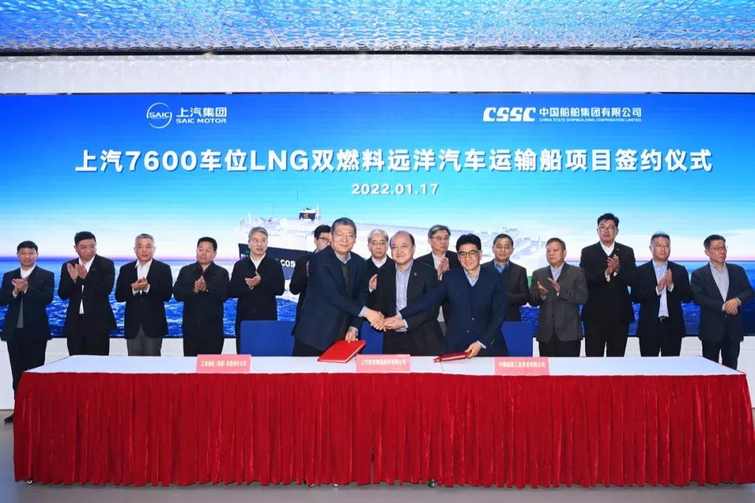 1月17日,中國船舶集團旗下江南造船攜手中船貿易與上汽集團旗下安吉物流簽訂2艘7600車位液化天然氣(LNG)雙燃料遠洋汽車運輸船建造合同。中國船舶集團黨組書記、董事長雷凡培,上汽集團黨委書記、董事長陳虹出席簽約儀式。