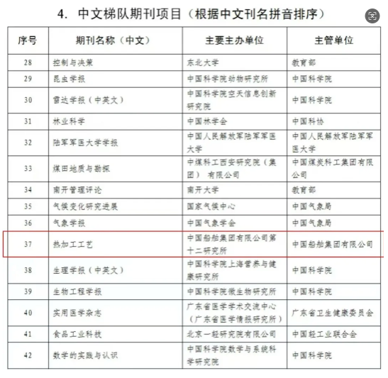 近日,中國科技期刊卓越行動計劃二期(2024—2028年)入選結果公布,由中國船舶集團有限公司主管、中國船舶集團第十二研究所和中國造船工程學會聯合主辦的《熱加工工藝》期刊,成功入選“中文梯隊期刊”項目。這也是中國船舶集團唯一成功入選卓越行動計劃二期的期刊。