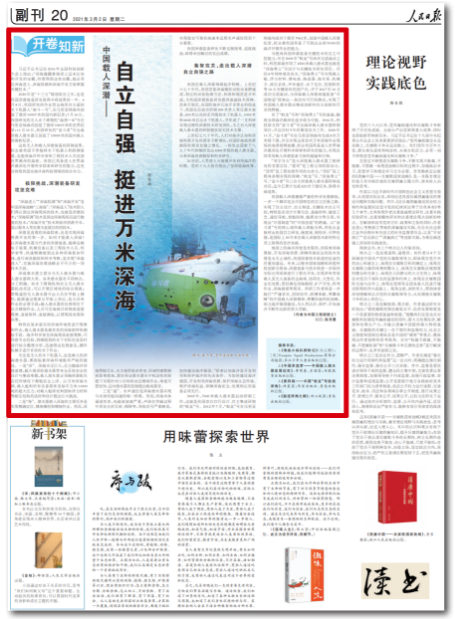 3月2日,人民日報 “開卷知新” 專欄刊發(fā)“蛟龍?zhí)枴笨傇O(shè)計師中國工程院院士中國船舶集團(tuán)七〇二所研究員徐芑南文章《中國載人深潛——自立自強(qiáng) 挺進(jìn)萬米深海》。