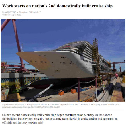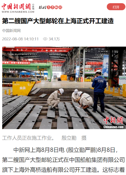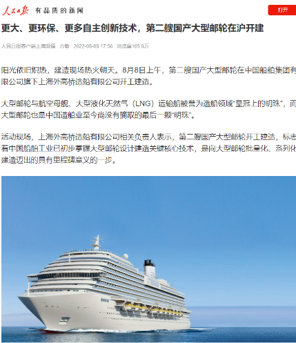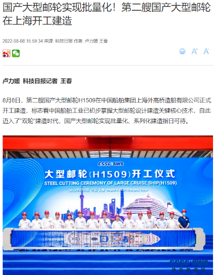 8月8日,第二艘國產(chǎn)大型郵輪在中國船舶集團旗下外高橋造船開建,這標志著中國船舶工業(yè)已初步掌握大型郵輪設(shè)計建造關(guān)鍵核心技術(shù)。