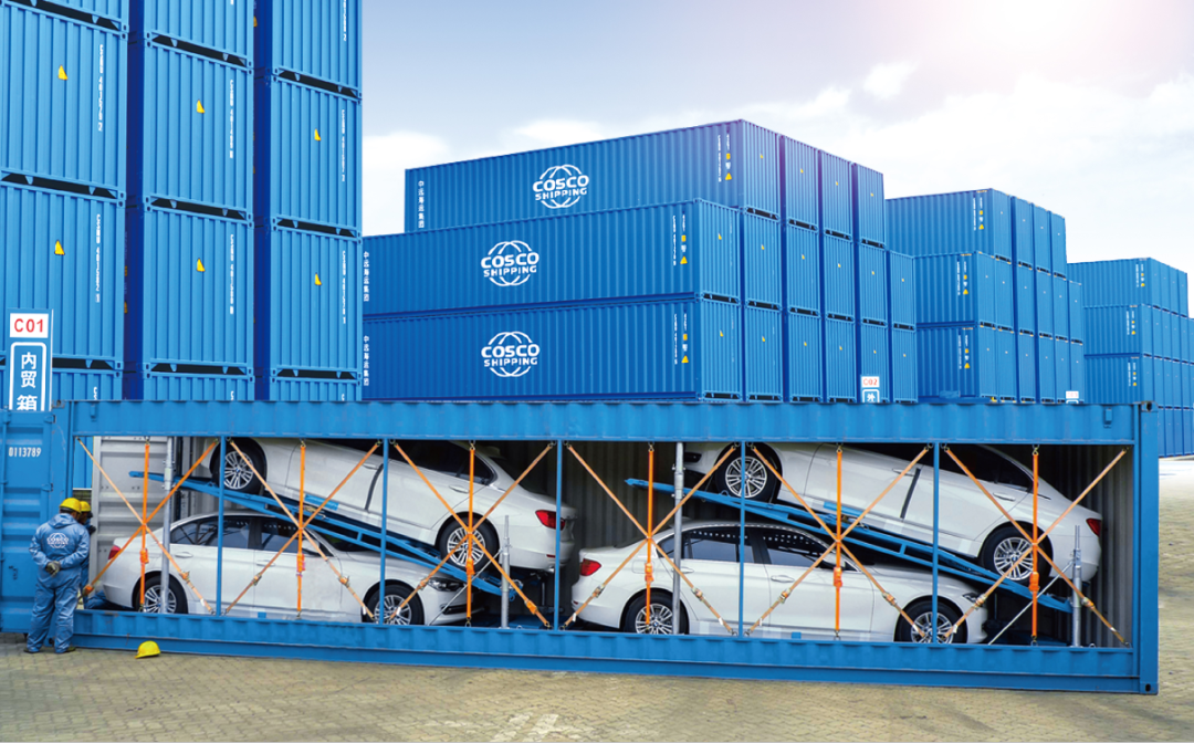 花式運(yùn)輸?shù)牡谝徽惺羌b箱整車運(yùn)輸。 通過(guò)集裝箱整車支架技術(shù),可自由選擇將2—4輛汽車裝入一個(gè)集裝箱內(nèi), 最大程度上節(jié)省平鋪擺放占用面積,可堆疊的三維布局如同為汽車打造了一幢安如磐石的“海上公寓”。