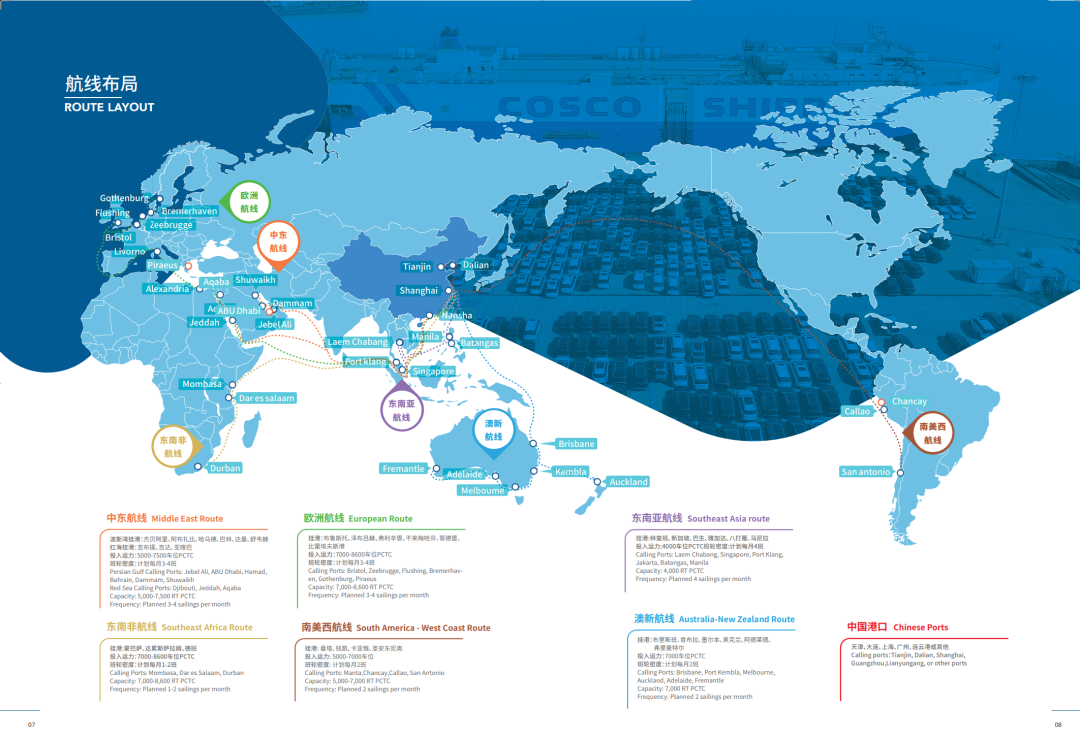 根據(jù)客戶需求,中遠(yuǎn)海運(yùn)協(xié)同船隊(duì)與港口優(yōu)化航線設(shè)置和運(yùn)力配置,靈活調(diào)整全球航線布局,開(kāi)通中東波斯灣、東南亞、歐洲、墨西哥、中南美洲、非洲等班輪航線,為客戶定制商品車運(yùn)輸整體解決方案,提供多船型、全程端到端物流服務(wù)。