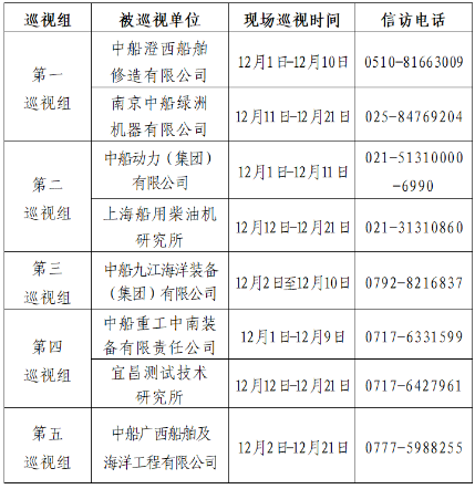 根據(jù)中國(guó)船舶集團(tuán)黨組2022年第二輪巡視工作部署,截至2022年12月2日,中國(guó)船舶集團(tuán)黨組5個(gè)巡視組已進(jìn)駐中船澄西船舶修造有限公司、中船動(dòng)力(集團(tuán))有限公司、中船九江海洋裝備(集團(tuán))有限公司、中船重工中南裝備有限責(zé)任公司、中船廣西船舶及海洋工程有限公司等單位,開展為期20天左右的巡視“回頭看”。巡視期間,巡視組設(shè)置專門值班電話(具體如下表),同時(shí)在巡視組工作現(xiàn)場(chǎng)設(shè)置聯(lián)系信箱,廣大干部職工可以反映情況。